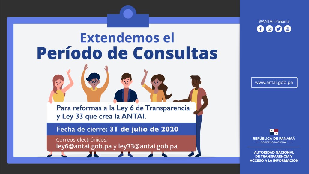 Panamá, 27 de mayo de 2020. La Autoridad Nacional de Transparencia y Acceso a la Información, ANTAI, comunica a la ciudadanía la ampliación hasta el 31 de julio de 2020 del proceso de consultas para elaborar recomendaciones que tendrán como fin, reformar la ley 6 de 2002 y ley 33 de 2013, respectivamente.