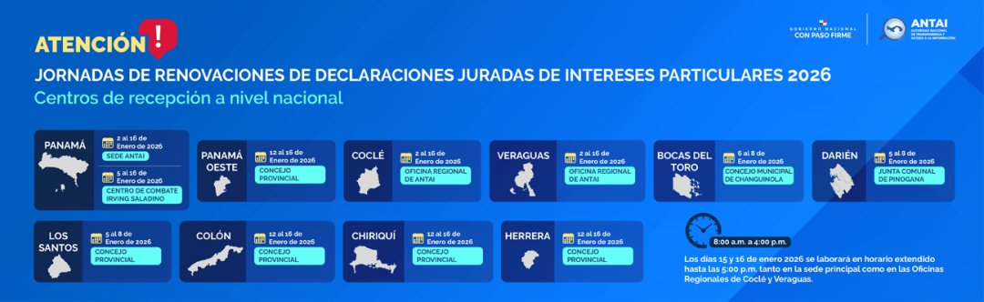 Panamá, 24 de noviembre 2025. "Con el fin de facilitar a los jefes diplomáticos o consulares que se encuentren fuera del país en cumplimiento de sus funciones, la ANTAI mediante Resolución No. ANTAI-DS-015-2025 de 12 de noviembre de 2025, publicada en Gaceta Oficial No. 30409 de 20 de noviembre de 2025, ha establecido el correo electrónico: declaracionesjuradasdeintereses@antai.gob.pa, para la presentación de ...